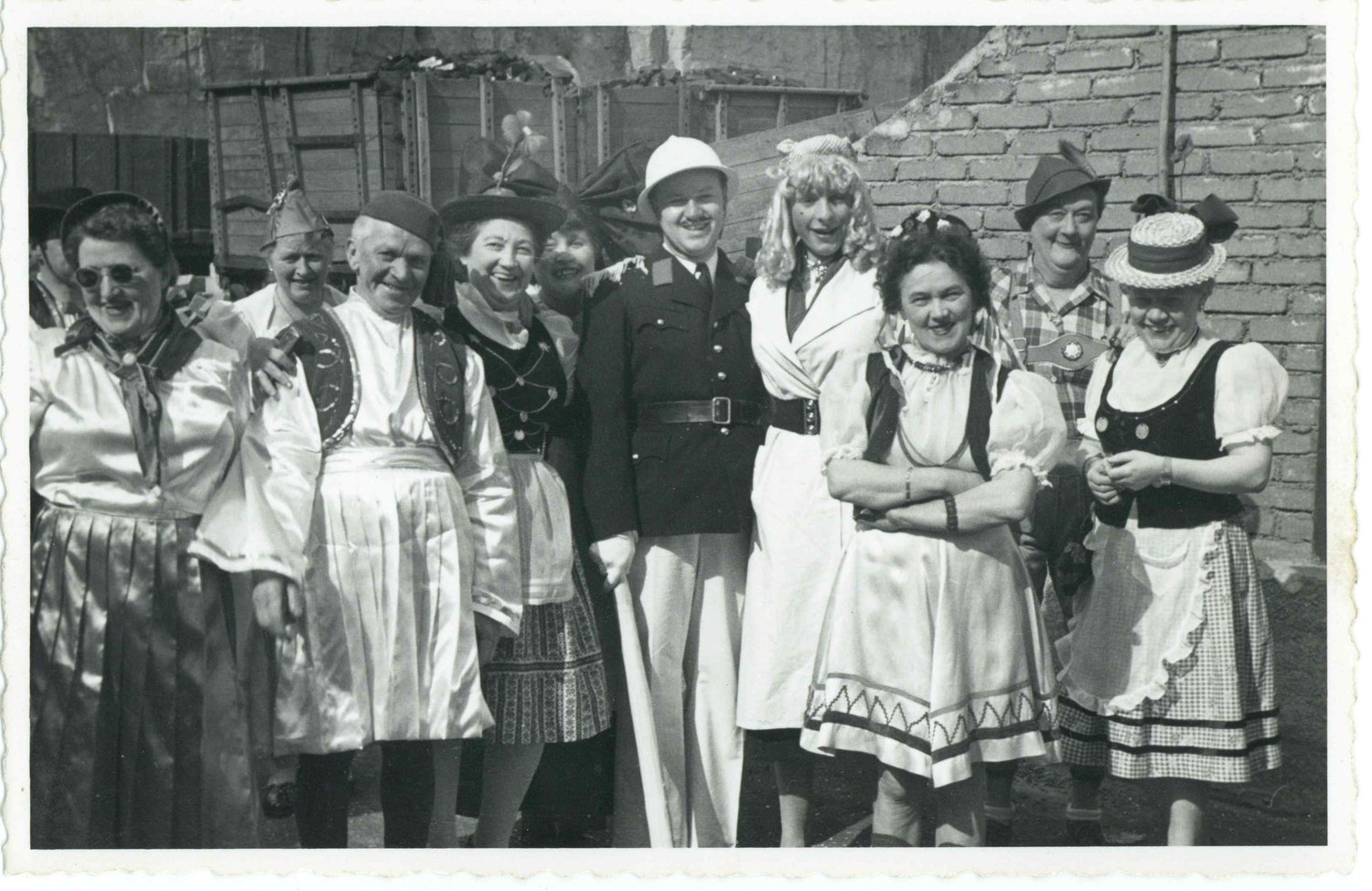 Bratzelesonndeg, den 28. Mäerz 1954, zu Réimech op der Gare. Am Hannergrond de Jangeli mat Waggone voller Kuelen.